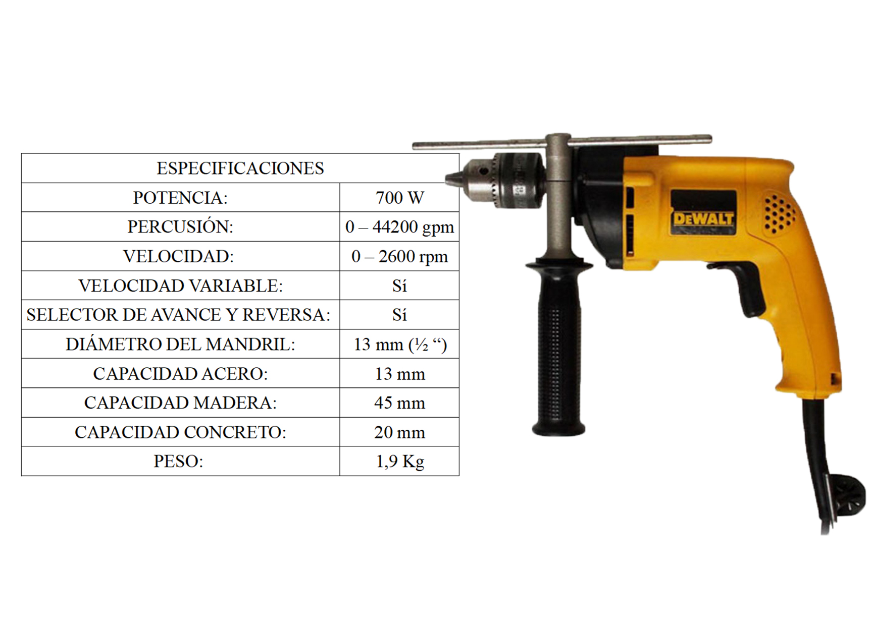 Potencia: 550 W Velocidad: 2900/min (rpm) IPM: 46400ipm (bpm) Mandril: 3/8" (10 mm) Traba de