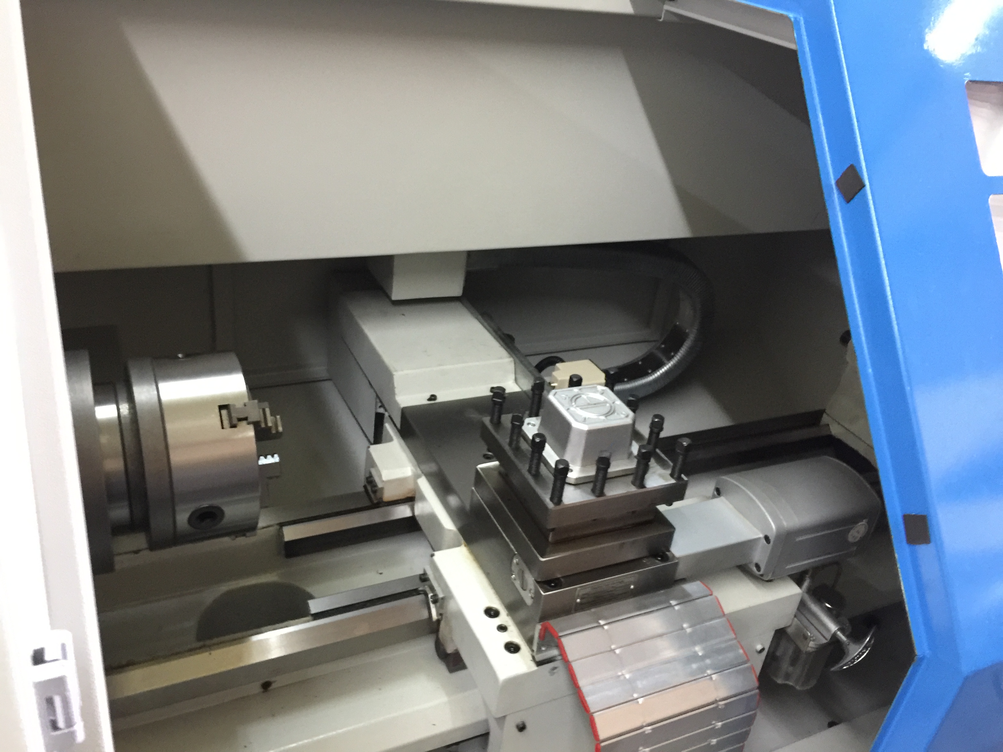 Descripción: NUEVO TORNO CNC TANGO 320 MM INGENIERIA TURRI 5,5 HP DE MOTOR PRINCIPAL ,HUSILLO DE PASAJE INTERIOR DE 60 MM OPCION PLATO NEUMATICO 200 MM ,PASO DE BARRA 40 MM CABEZAL CNC REFRIGERADO POR AIRE 2500 RPM DE MAXIMA ,VELOCIDAD DE CORTE CONSTANTE CONTROL PROGRAMACION FANUC ,SIMULACION EN PANTALLA,CORRECTOR DE RADIO DE HERRAMIENTAS PUERTO USB PARA USO CON MEMORIA EXTERNA! FACIL TRANSMISION DE PROGRAMAS TUTORIALES DE PROGRAMACION GRATIS ! BANCADA DE 210 MM DE ANCHO. 320 MM DE VOLTEO 650 MM ENTRE PUNTAS   CARACTERÍSTICAS TÉCNICAS Máx. oscilación sobre el banco 360mm Máx. oscilación sobre el carro 150mm Máx. longitud de corte 500/750mm Ancho del carril 260mm Nariz del eje A2-6 Agujero del eje 60mm Conicidad de la velocidad del eje MT6 Rango de la velocidad del eje 150-2500rpm Recorrido del eje X 350mm Recorrido del eje Z 500/750 rpm Velocidad rápida X/Z 4/7m/min Estación del portaherramientas 4 o 6 o 8 Sección máxima del peaje 20x20mm Trazo del mango de contrapunto 100mm Diámetro/agujero del mango de contrapunto 50mm/MT4 Potencia del motor principal 3.7 kW Potecia de la bomba refrigerante 120W Dimensiones generales 1740/2000x1210x1650mm Tamaño del aparcamiento 1960/2230x1410x1990mm Peso neto 1275/1450KG Peso bruto 1450/1600KG